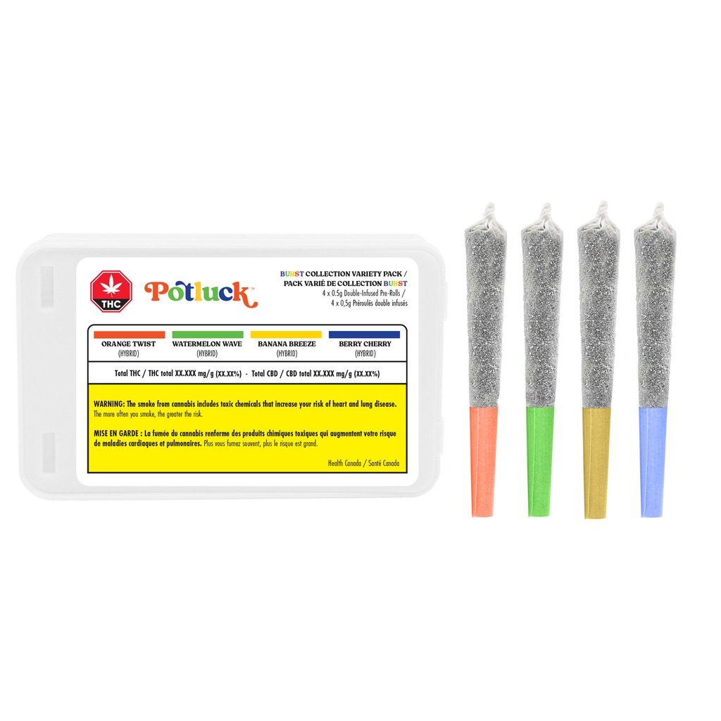 Crafted with our proprietary dry-infusion technology, Potluck Burst Infused Pre-Rolls are the best burning infused pre-rolls with a slow, smooth, and clean burn and no clogs—just bold flavour and high potency.