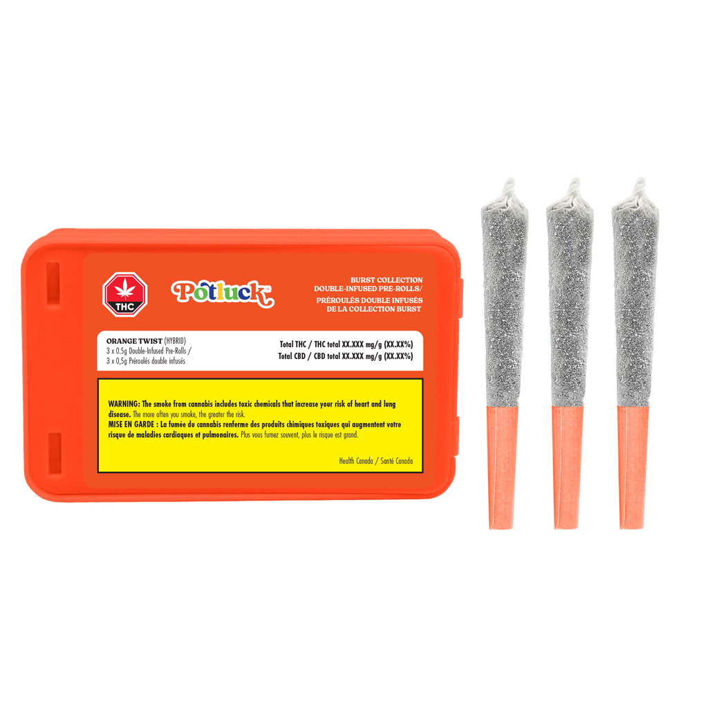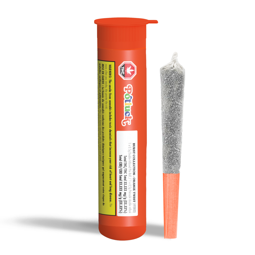 Orange Twist is a citrus-loaded rocket from Potluck’s Burst Collection—a double-infused pre-roll packed with zesty orange terpenes, high-THC isolate, and finished with a diamond coating for extra lift-off. Crafted with our proprietary dry-infusion technology, it burns slow, smooth, and clean—no clogs, just pure flavour. With bright citrus, floral spice, and a heavy-hitting pull, Orange Twist is your ticket to orbit. Potluck Burst brings the best-burning, most flavourful infused pre-rolls in the galaxy—buckle up, this one’s out of this world.