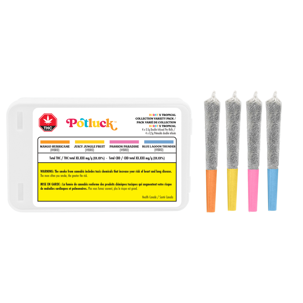 Blast off to a new oasis with Potluck's Tropical Burst Collection! Enjoy double-infused, diamond coated pre-rolls in Mango Hurricane, Juicy Jungle Fruit, Blue Lagoon Thunder, and Passion Paradise Punch.