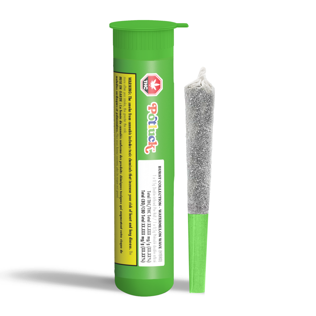 Discover bold cannabis fruit flavours from Potluck's Burst Collection! Watermelon Wave offers a sweet, fruity profile with grape undertones. Each 0.5g pre-roll is hand-finished with whole flower and infused with a proprietary blend of THCa isolate, then covered in diamonds for potency and flavour.