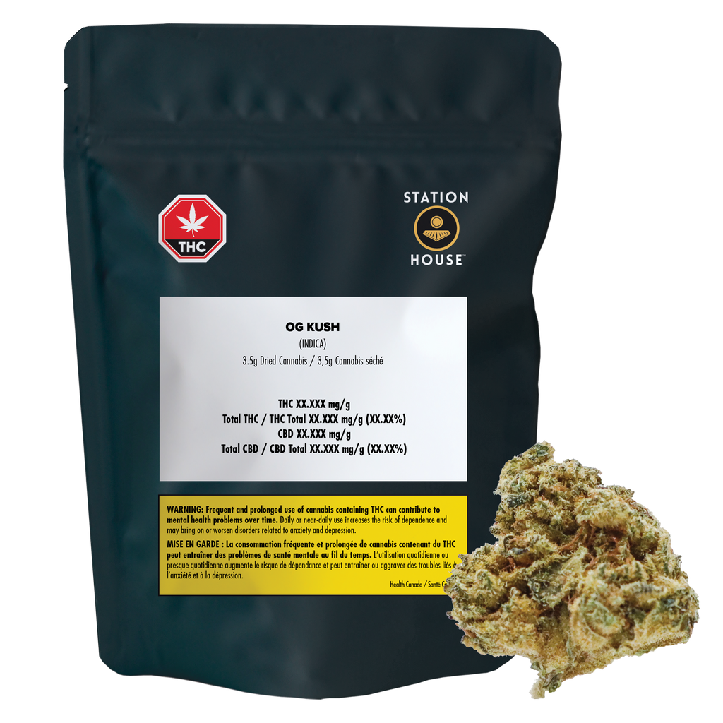 OG Kush is a legacy indica from the 90s, born in Northern California and known for its loud skunky aroma and heavy gassy undertones. This original cultivar features dense, trichome-rich buds with serious old-school appeal. Packed as whole flower for those who like to grind it their way. A West Coast classic—always ready to pack by Station House, home of Canada’s Best Pre-Roll.